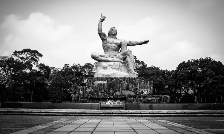 The black monolith marking the hypocenter of the atomic bomb blast three days after Hiroshima.